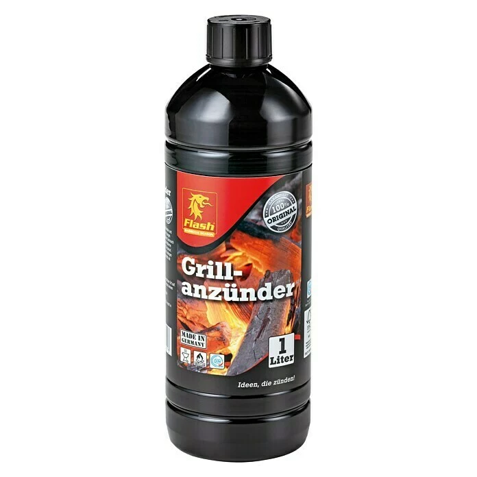 Der flüssige Grillanzünder von Flash steht für sicheres Anzünden von Grill-Holzkohlebriketts und Grill-Holzkohle. Die Flasche enthält einen Kindersicherheitsverschluss und ist nach DIN geprüft.