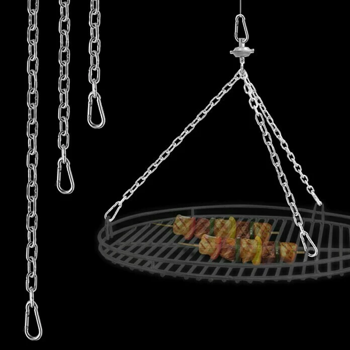 Mit diesem Kettenkit Grillzubehör können Grillroste ganz einfach am Schwenkgrill aufgehängt werden. Der kugelgelagerte Seilwirbel aus rostfreiem Edelstahl verhindert hierbei, dass sich der Grillrost anhaltend drehen kann, ohne dass sich die Ketten sich verheddern. Mithilfe der Karabinerhaken lässt sich der Rost leicht ein- und wieder aushängen. Das Kettenkit eignet sich ideal für Grillroste bis zu einem Durchmesser von 60 cm.