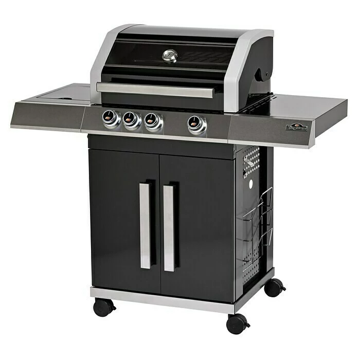 Der doppelschichtige Deckel, der Feuerkasten, sowie der Flammenverteiler wurden emailliert, was eine besonders leichte Reinigung ermöglicht Zur einfachen Bedienbarkeit des Gasgrills bei Dunkelheit, können die Bedienknöpfe dank LED weiß beleuchtet werden. Durch die Rollen am Grillwagen ist der Gasgrill mühelos zu verschieben und mithilfe von Bremsen sicher in Position zu bringen. Im Lieferumfang enthalten sind außerdem ein Grillspieß mit Motor, Zubehörhalter, Flaschenöffner, Gasschlauch und Druckminderer.