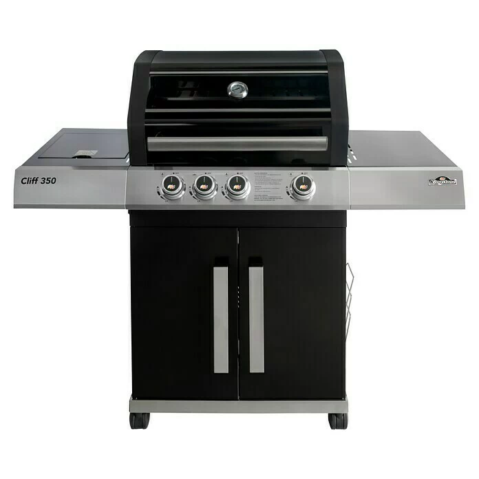 Der Kingstone Gasgrill Cliff 350 ist mit drei Hauptbrennern ausgestattet und ist das ideale Einsteigermodell mit Profi-Ausstattung und optimalem Komfort. Die Piezo-Zündung garantiert ein einfaches und sicheres Zünden der Brenner auf Knopfdruck. Der Grill verfügt über gusseiserne Grillroste und einen Pizzastein, die bei Bedarf bequem gewechselt werden können. Der doppelschichtige Deckel, der Feuerkasten, sowie der Flammenverteiler wurden emailliert, was eine besonders leichte Reinigung ermöglicht Zur einfachen Bedienbarkeit des Gerätes bei Dunkelheit können die Bedienknöpfe dank LED weiß beleuchtet werden. Dank der Rollen am Grillwagen ist der Gasgrill mühelos zu verschieben und mithilfe von Bremsen sicher in Position zu bringen.