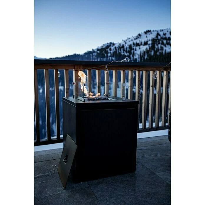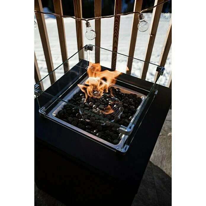 Die Feuerstelle mit ihrer verstellbaren Flamme wird mit handelsüblichem Flaschengas (5 oder 11 kg) betrieben und sorgt durch die flackernde Flamme für eine gemütliche Atmosphäre. Die Dekoglasperlen, die den Brenner dekorativ abdecken, ähneln Natursteinen, so dass es scheint, das die Flamme direkt aus dem Steinbett kommt.