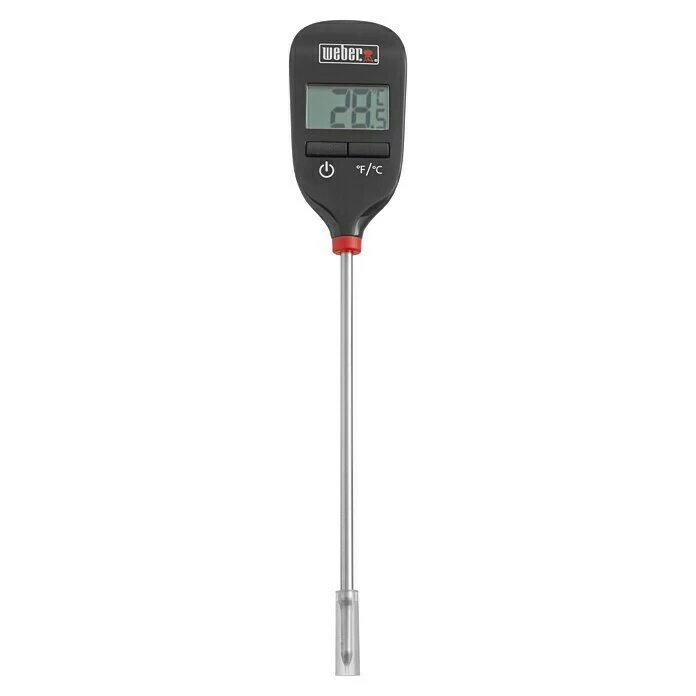 Mit dem Weber Taschenthermometer ist perfektes Fleisch keine Herausforderung mehr, egal ob medium, rare oder well done. Die digitale Anzeige kann auf Celsius oder Fahrenheit eingestellt werden und garantiert eine schnelle Temperaturbestimmung. So muss der Deckel nicht zu lange offen bleiben und das Grillgut trocknet nicht aus. Die Edelstahlspitze lässt sich ganz einfach von Hand reinigen. Dank der kompakten Größe und der Kunststoffkappe ist das Weber Thermometer der ideale Begleiter für Campingausflüge.