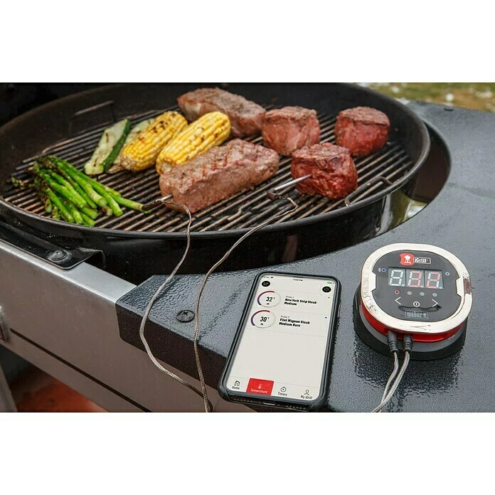 Das Grill-Thermometer iGrill 2 von Weber macht das perfekte Grillen zum Kinderspiel. Über die kostenlose Weber iGrill-App ist eine exakte Kontrolle der Grilltemperatur möglich. Funktionen wie Temperaturbenachrichtigung oder Garzeit-Tracking erlauben ein modernes Grillen mit exakten Grillergebnissen. Das Bluetooth-Grillthermometer zeigt mittels 4-Farben-Spektrum und LED-Temperaturanzeige das Fortschreiten des Grillvorgangs an, sodass der Grill oder der Smoker geschlossen bleiben können und eine konstante Temperatur für gleichmäßiges Garen erreicht wird. Ein weiterer Vorteil ist, dass über die Bluetooth-Verbindung eine Anwesenheit direkt am Grill nicht erforderlich ist. So kann sich der Anwender beispielsweise beim langsamen Garen seinen Gästen widmen und wird doch rechtzeitig an das Grillgut erinnert. Im Lieferumfang sind zwei Temperaturfühler enthalten, zusätzlich können zwei weitere Fühler angeschlossen werden.